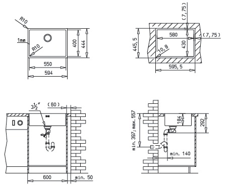 • Указанные размеры относятся к обычному встраиванию и встраиванию вровень со столешницей.