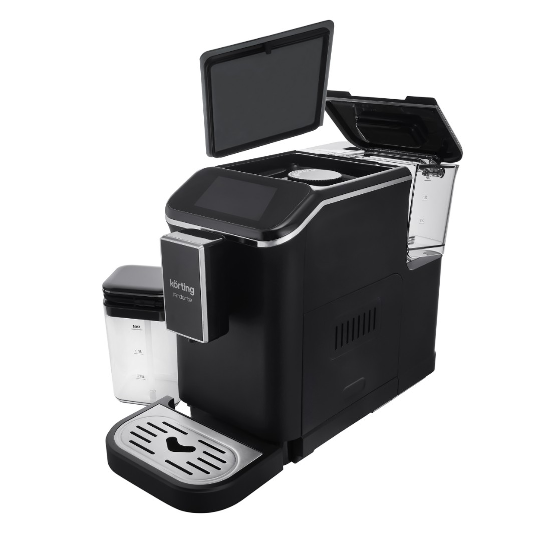 Кофемашина Korting KACM 2002 Andante — это современный прибор с большим количеством настроек, выполненный в строгом черном цвете. Она предназначена для приготовления как зернового, так и молотого кофе и оборудована итальянской помпой с давлением 20 бар, что обеспечивает идеальное извлечение ароматов и вкусов. Модель предлагает восемь автопрограмм с возможностью ручной настройки, что дает пользователю возможность разрабатывать и сохранять индивидуальные рецепты. Сенсорный экран с видеосопровождением облегчает выбор и управление машиной. Кофемашина поддерживает 15 уровней помола, а встроенный капучинатор позволяет готовить великолепные кофейные напитки с молоком одним нажатием сенсорной кнопки. Резервуар для молока объемом 750 мл, входящий в комплект, удобно убирается в холодильник для хранения.