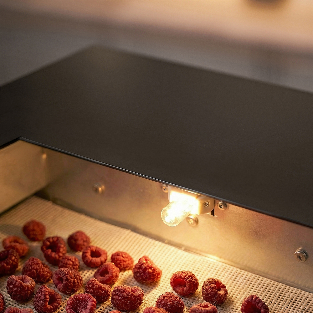 Чёрный корпус из нержавеющей стали, устойчивый к нагреву, влаге и коррозии, выглядит лаконично и современно, легко вписывается в интерьер кухни или мастерской. Внутри установлено 12 поддонов из нержавеющей стали с зазором 25 мм — этого достаточно, чтобы удобно размещать ломтики фруктов, травы или мясные полоски.
