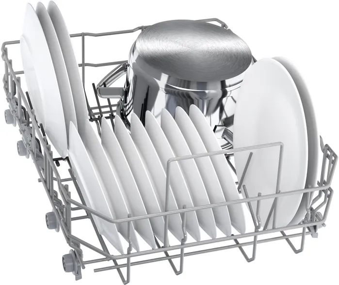 Посудомоечная машина Bosch SPV4HMX10E — узкая модель, которая рассчитана на единовременную обработку до десяти комплектов посуды. Прибор выполнен в корпусе цвета нержавеющей стали, встраивается в нишу размером 81,5-87,5х45х55 см. Регулируемые задние ножки помогут нивелировать неровности пола.