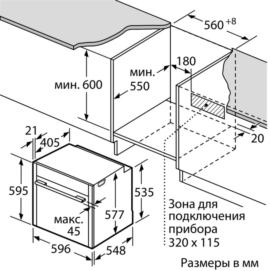• Размеры ниши для встраивания, см (В х Ш х Г): 58.5-59.5 х 56-56.8 х 55