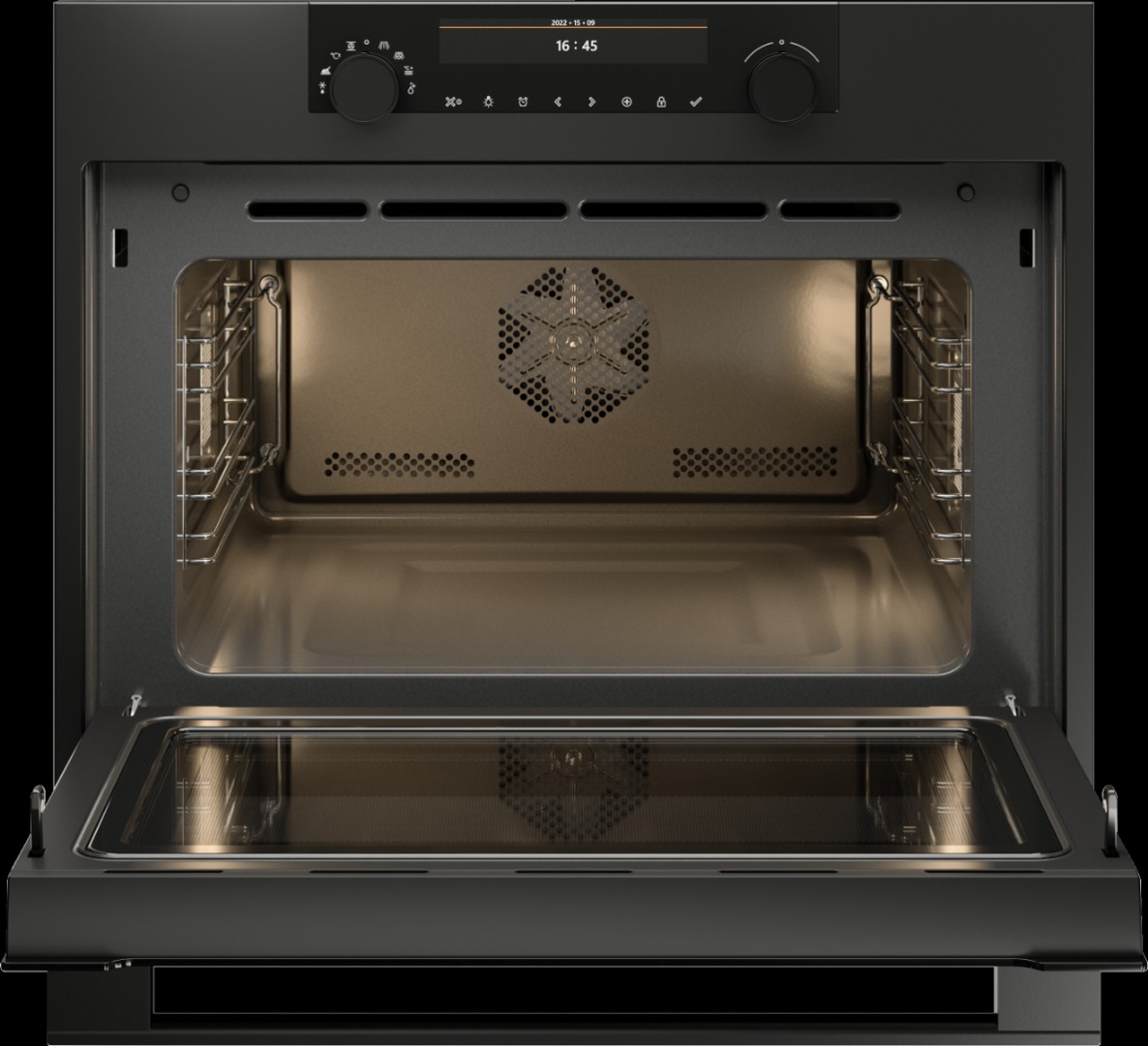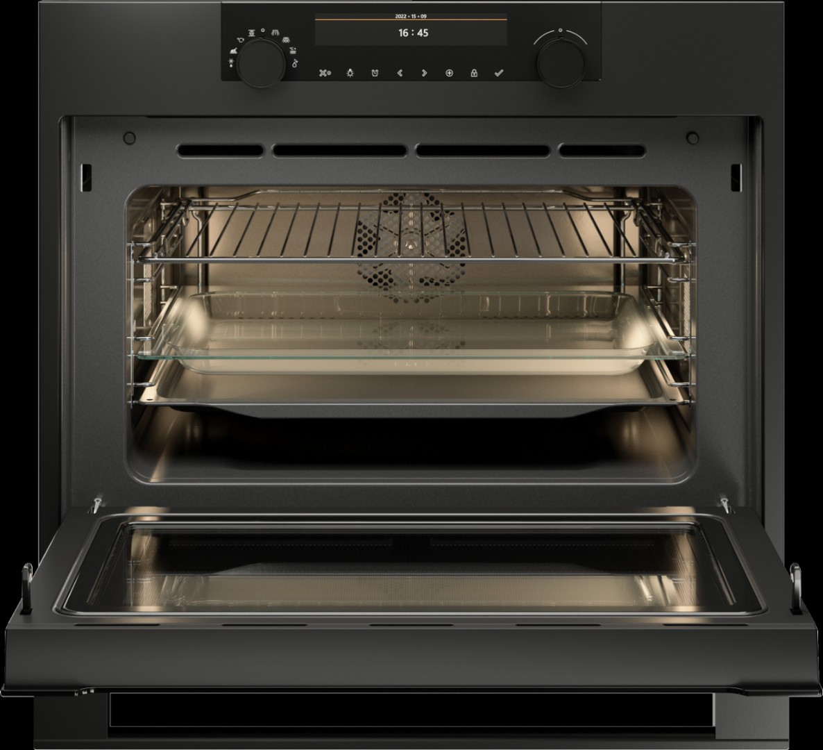 Конструкция дверцы с применением трех стекол позволяет снизить температуру фронтальной поверхности до минимума. Все это снижает потребление электроэнергии и делает приготовление полностью безопасным.