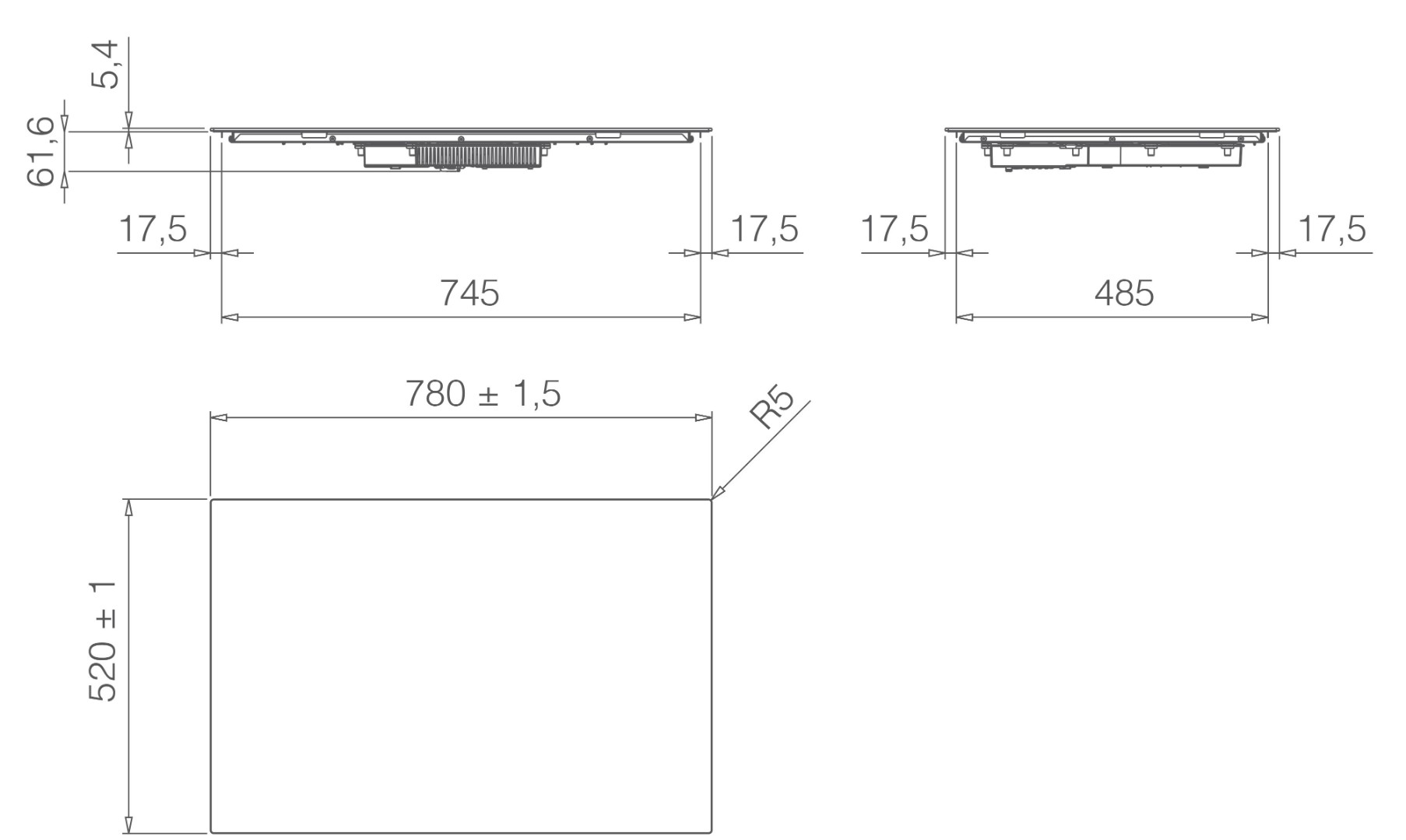 - Ближняя, левая конфорка: Ø 18 cm - 1,5/2,0 kW
