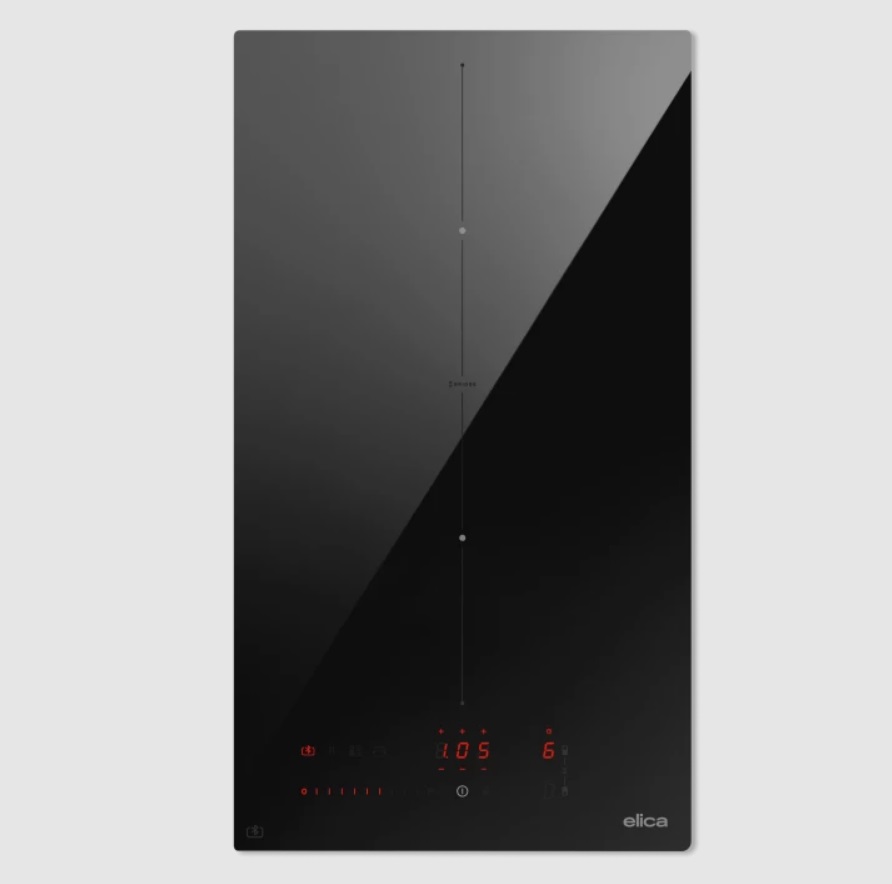 Варочная панель синхронизируется с вытяжками Elica по Bluetooth, автоматически регулируя яркость и интенсивность вытяжки в зависимости от используемых зон нагрева.