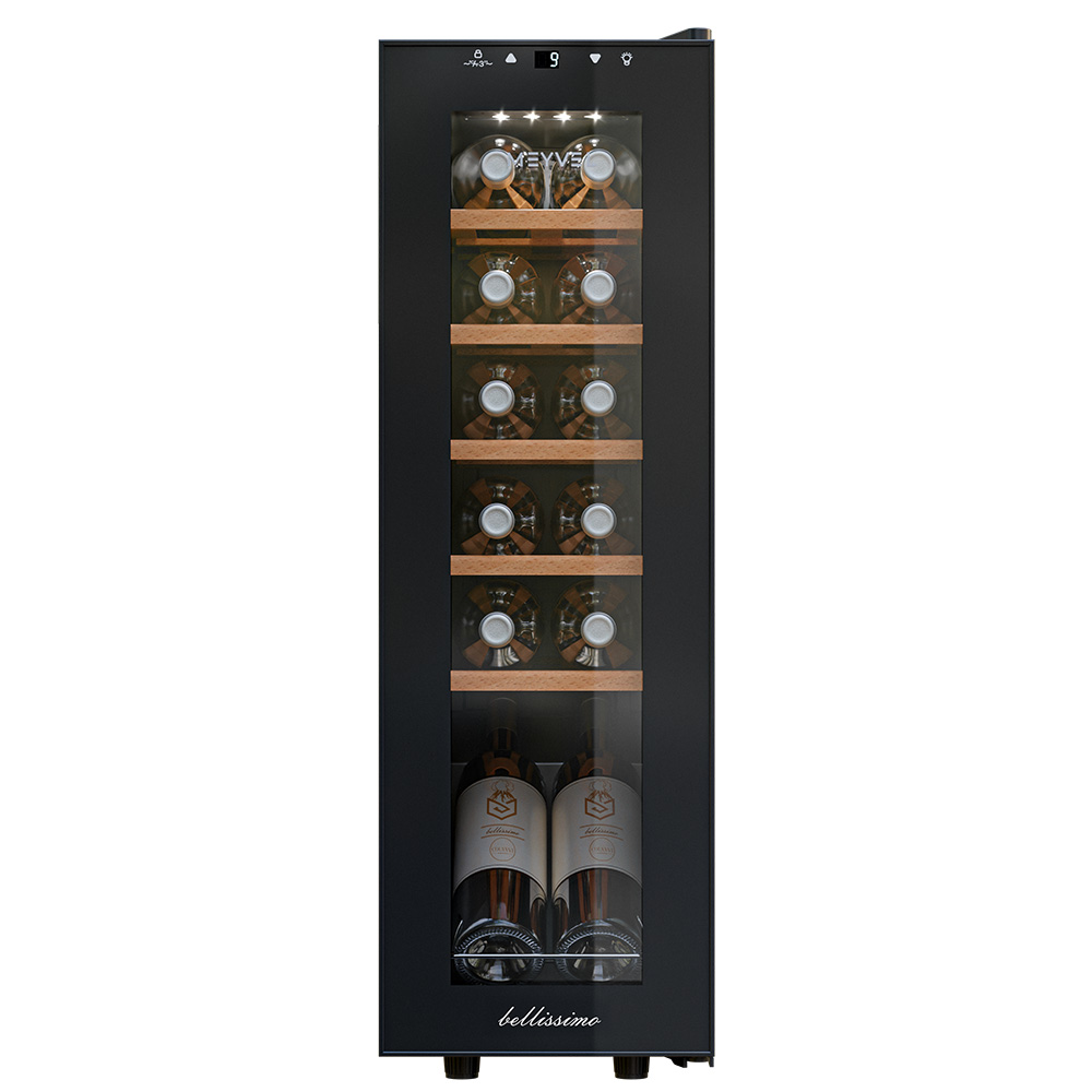 В винный шкаф помещается 12 бутылок, и это оптимальный объём для тех, кто только начинает собирать коллекцию или предпочитает держать под рукой небольшой, но тщательно отобранный набор вин. При этом устройство не выглядит громоздким и отлично вписывается даже в небольшие помещения.
