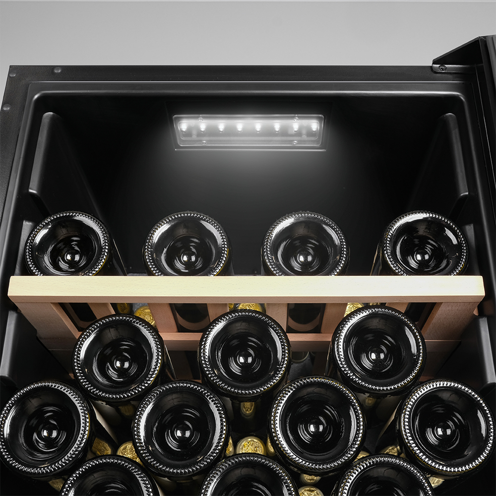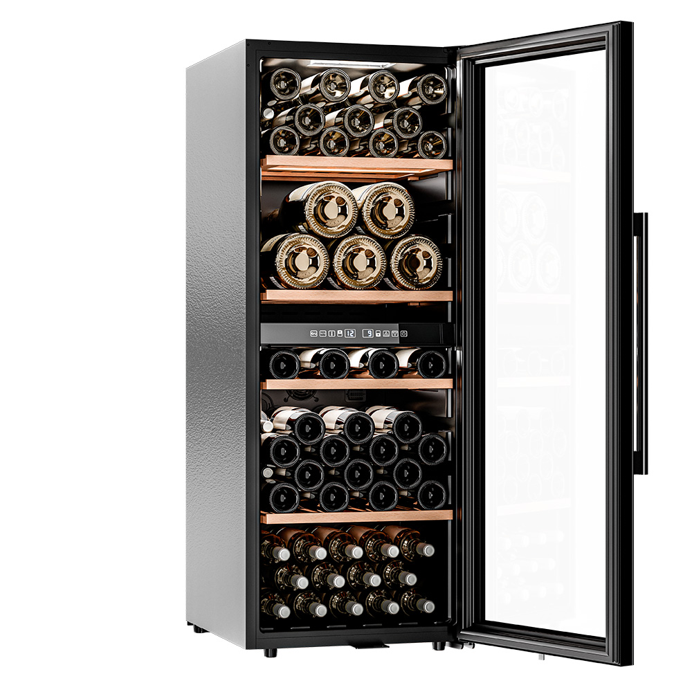 Управление осуществляется через сенсорную панель, а настройка интуитивно понятна. Также предусмотрены важные функции для защиты винотеки: замок на двери для безопасности, угольный фильтр, который очищает воздух внутри шкафа от посторонних запахов, сигнализация отклонения температуры, которая предупреждает о любых изменениях в условиях хранения, и блокировка панели управления, предотвращающая случайные изменения настроек.