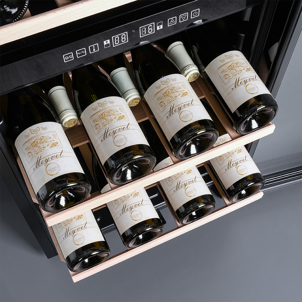 Meyvel MV98-KBF2 оборудован двумя температурными зонами, чтобы эффективно хранить различные сорта вин. В верхней зоне температура регулируется в диапазоне от +5 до +12°C, которая идеальна для белых вин и шампанского. Нижняя зона предлагает температурный режим от +12 до +20°C, подходящих для красных вин. Это обеспечивает индивидуальный подход к каждому виду вина. Благодаря большому расстоянию между полками в шкаф помещаются не только бутылки 0,75 л типа «Бордо», но и большего объема. Бутылки также можно установить стоя.