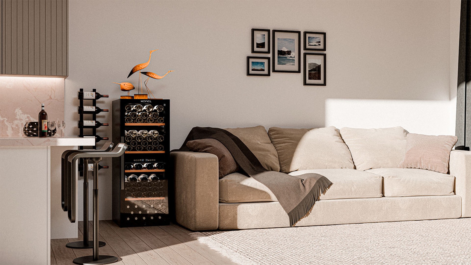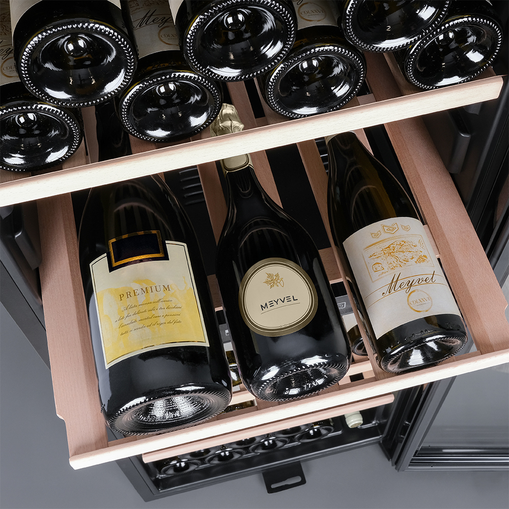 Meyvel MV98-KBF2 — отдельностоящее устройство, поэтому можно разместить его в любом удобном месте ресторана, отеля, бара или домашней винной комнаты без встраивания в мебель. Это удобно не только для создания стиля и атмосферы в интерьере, но и для предоставления легкого доступа к винам.