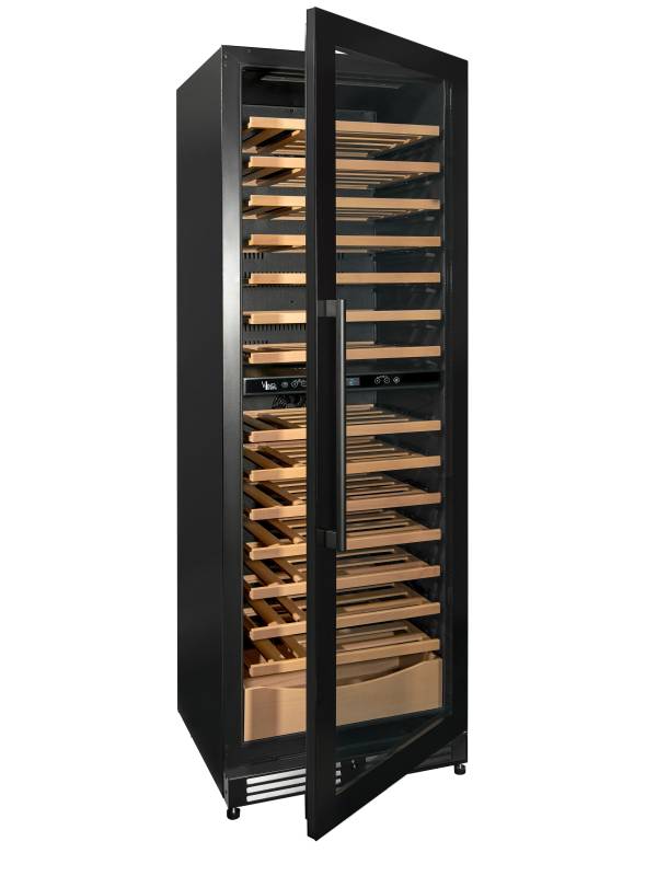 Шкаф оснащен: угольным фильтром, 14 выдвижными полками из натурального дерева и ящиком из дерева, белой LED подсветкой.