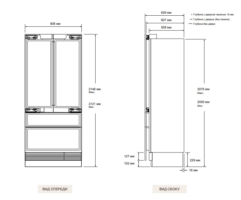 Благодаря красивому внешнему виду прибор приковывает взгляды. В нем объединены двухдверный холодильник, морозильный ящик и центральный выдвижной ящик, функционал которого можно изменить при необходимости.