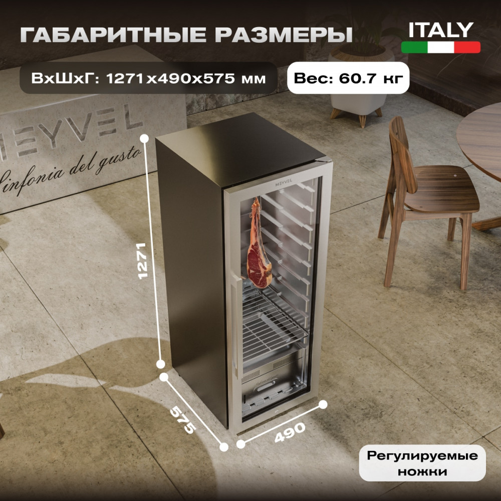 Отдельностоящий холодильник для мяса Meyvel MM-105SR — это идеальное решение для ресторанов, баров или магазинов. Встраиваемая модель объемом 172 литра вмещает до 105 кг мяса, обеспечивая оптимальные условия для его созревания.