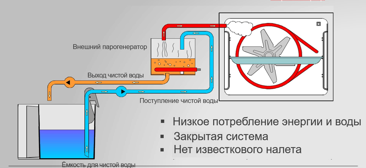 - Режим пара + ökotherm катализатор, комбинированное приготовление на пару, регенерация, отдельная функция 100% пара