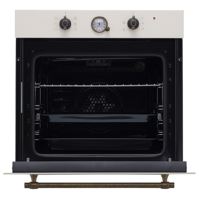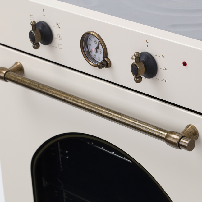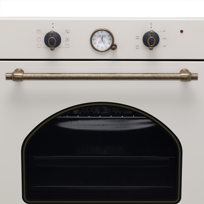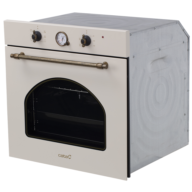 Электрический духовой шкаф Cata MRA 7108 IV (встраиваемый, 60 см) выполнен в стиле классического ретро с использованием белого и бронзового цветов, оснащен электронно-аналоговыми программатором.